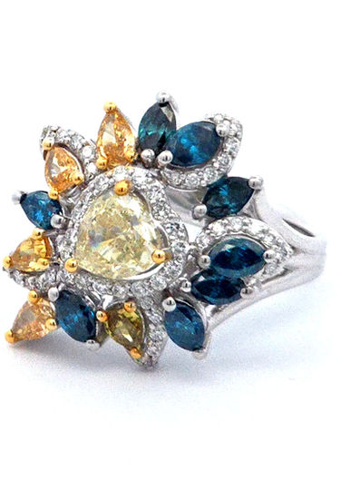 Yüzüğün ortasındaki 1.01ct fancy yellow renginde kalp kesim elmasın etrafını sıralı pırlantalar ile sardık. Çiçek buketini tamamlamak için kehribar renginde damla kesim ve markiz kesim mavi elmaslar yerleştirildi. 14 Ayar beyaz altın montür üzerinde tek tek el ile mıhlandı.